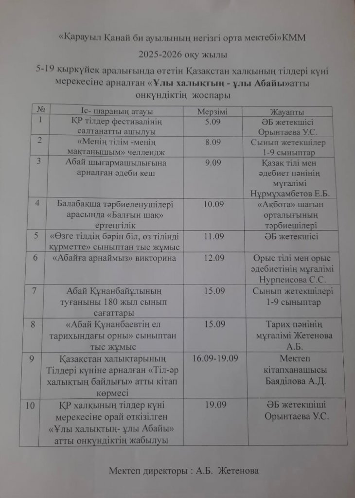 5-19 қыркүйек аралығында өтетін Қазақстан халқының тілдер күні мерекесіне арналған "Ұлы халықтың- ұлы Абайы" атты онкүндіктің жоспары.